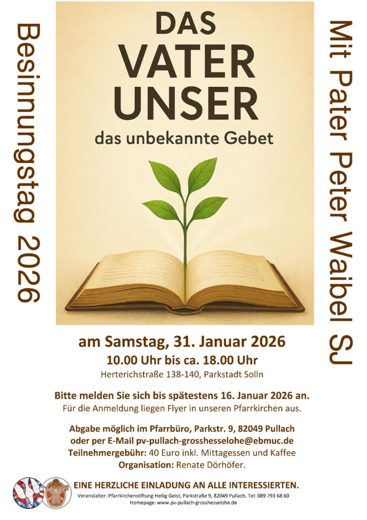 Merken Sie sich gerne den 31. Januar 2026 für unseren nächsten Besinnungstag des Pfarrverbands vor. Als Ort haben wir das Schönstatt-Zentrum in der Parkstadt Solln gebucht. Pater Waibel wird uns durch den Tag begleiten.