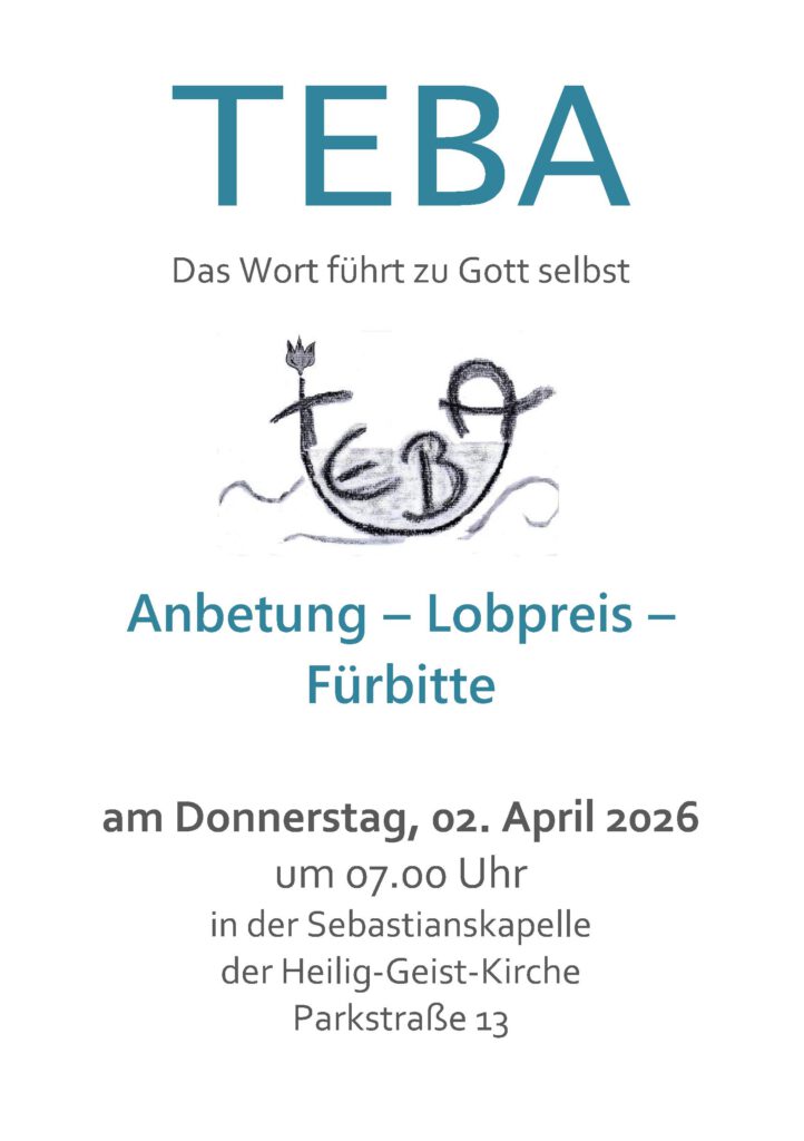 TEBA ist ein Morgenlob mit freiem Gebet, Lobpreis, neuen geistliche Liedern und Bibellesung. Wenn wir in der Bibel von der Arche lesen, steht im Hebräischen „teba“, was auch als „das Wort“ übersetzt werden kann. Somit trägt uns das Wort Gottes wie eine Arche durch die Sintflut unserer je eigenen Zeit. Beginnen Sie den Tag einmal anders!