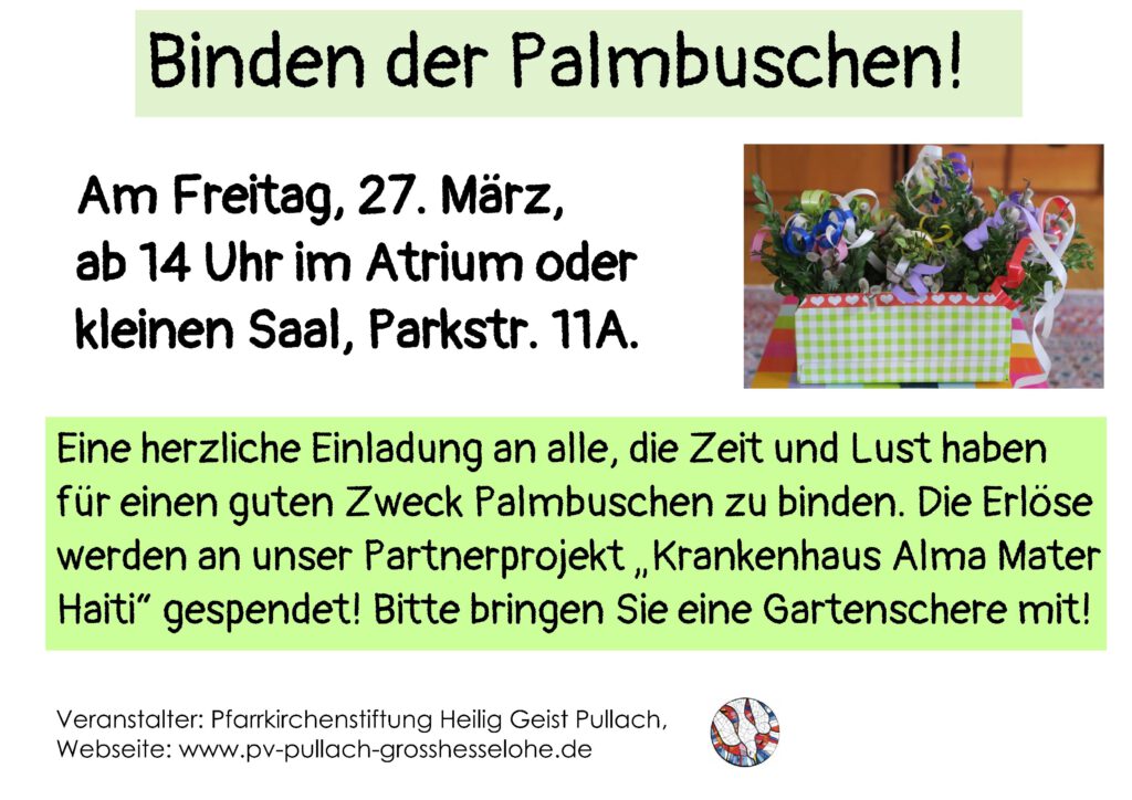 Zur Vorbereitung des Kleinen Ostermarkts am Wochenende von Palmsonntag treffen wir uns zum Palmbuschbinden. Jede / jeder ist herzlich willkommen. Bitte bringen Sie eine Gartenschere mit.