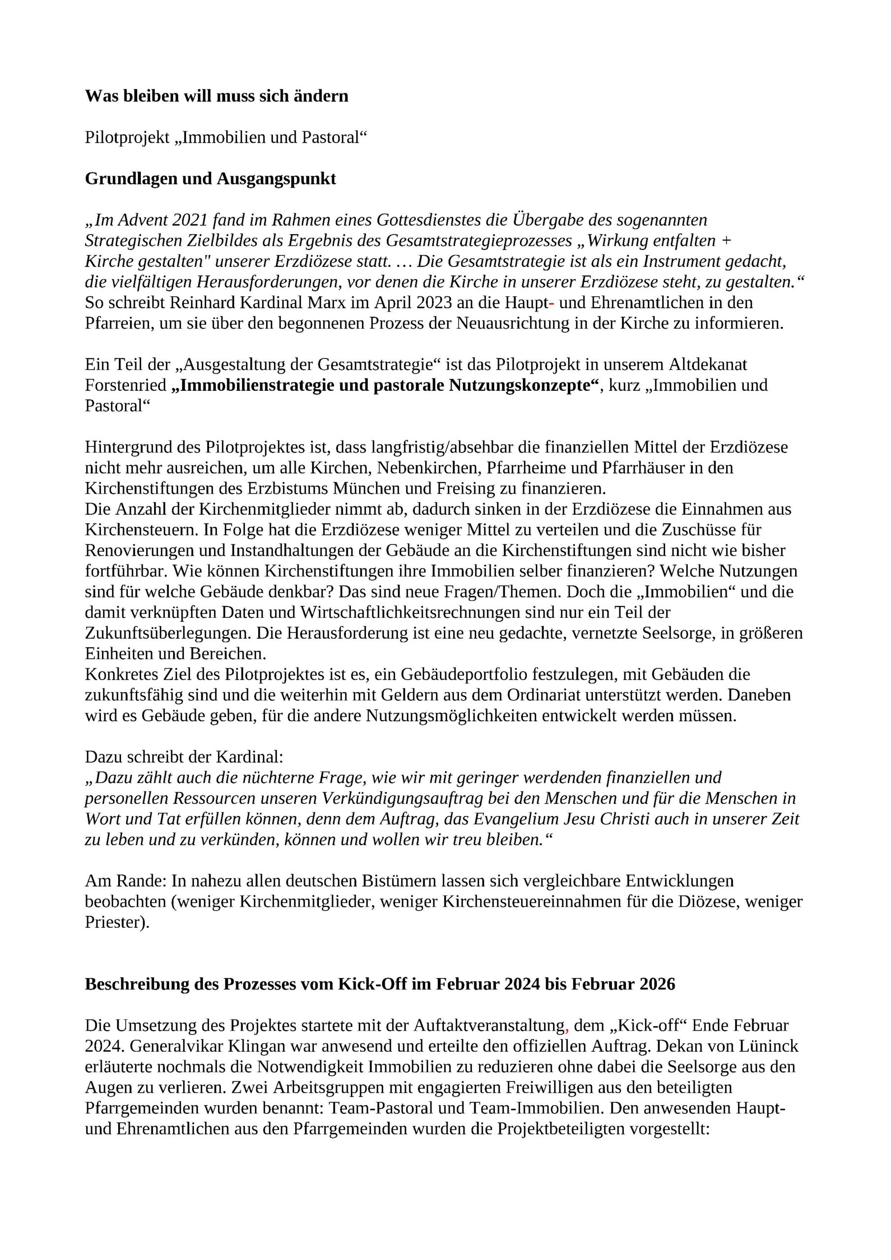 Ein Teil der „Ausgestaltung der Gesamtstrategie“ ist das Pilotprojekt in unserem Altdekanat Forstenried „Immobilienstrategie und pastorale Nutzungskonzepte“, kurz „Immobilien und Pastoral“