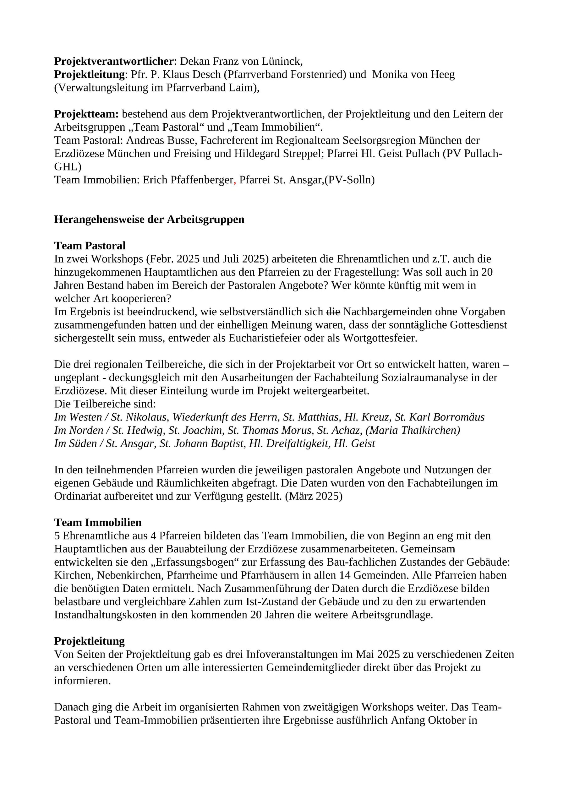 Projektteam: bestehend aus dem Projektverantwortlichen, der Projektleitung und den Leitern der Arbeitsgruppen „Team Pastoral“ und „Team Immobilien“.