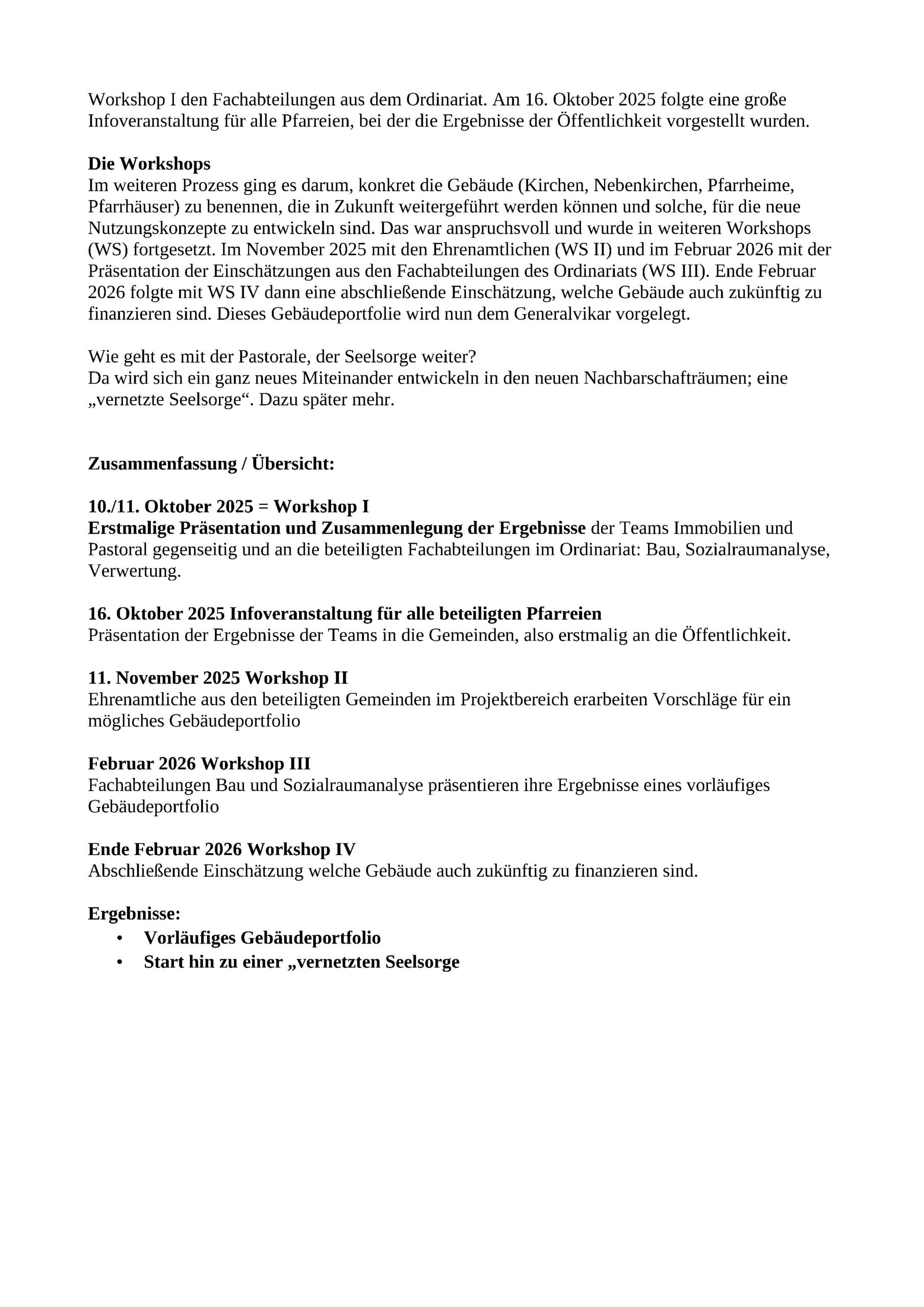 Danach ging die Arbeit im organisierten Rahmen von zweitägigen Workshops weiter. Das Team-Pastoral und Team-Immobilien präsentierten ihre Ergebnisse ausführlich Anfang Oktober in Workshop I den Fachabteilungen aus dem Ordinariat. Am 16. Oktober 2025 folgte eine große Infoveranstaltung für alle Pfarreien, bei der die Ergebnisse der Öffentlichkeit vorgestellt wurden.